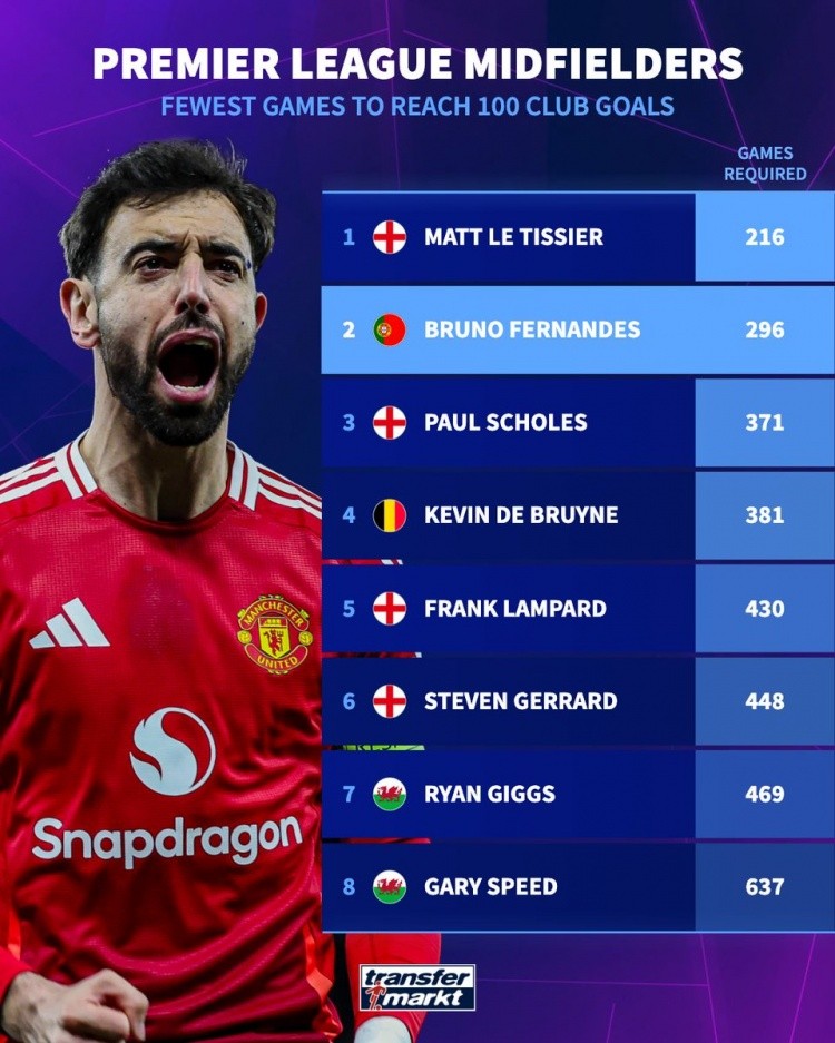 据德国转会市场统计,B费已为曼联打进100球,英超时代只有8名中场球员为俱乐部(所有赛事)打进100球,而B费是所用场次第2少的中场球员。