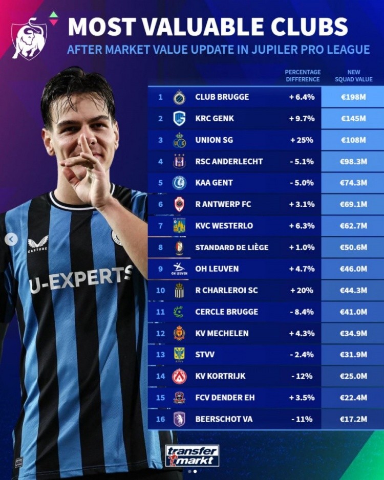 6月14日讯 德转更新比甲球员身价,布鲁日总身价1.98亿居首,亨克、圣吉罗斯二三位。