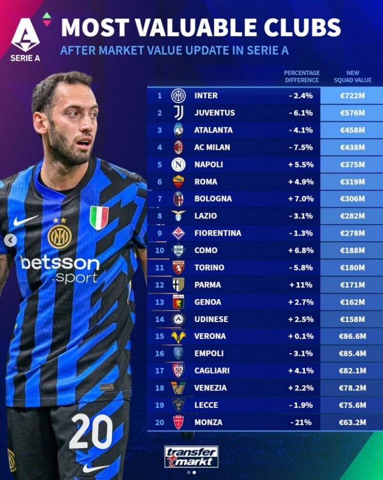 6月17日讯 意甲球员德转身价更新,德转列出了意甲球队总身价排行,国米居首,尤文、亚特兰大排在二三位。