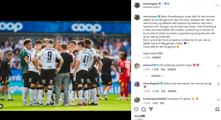 "亲爱的罗森博格大家庭:衷心感谢你们四年来给予的巨大支持!这段旅程如同过山车般起伏,但我会永远铭记巅峰时刻,带着它们继续前行!罗森博格不仅是足球,更是文化、团结与家庭。莱肯达尔球场拥有无可比拟的球迷与氛围。"